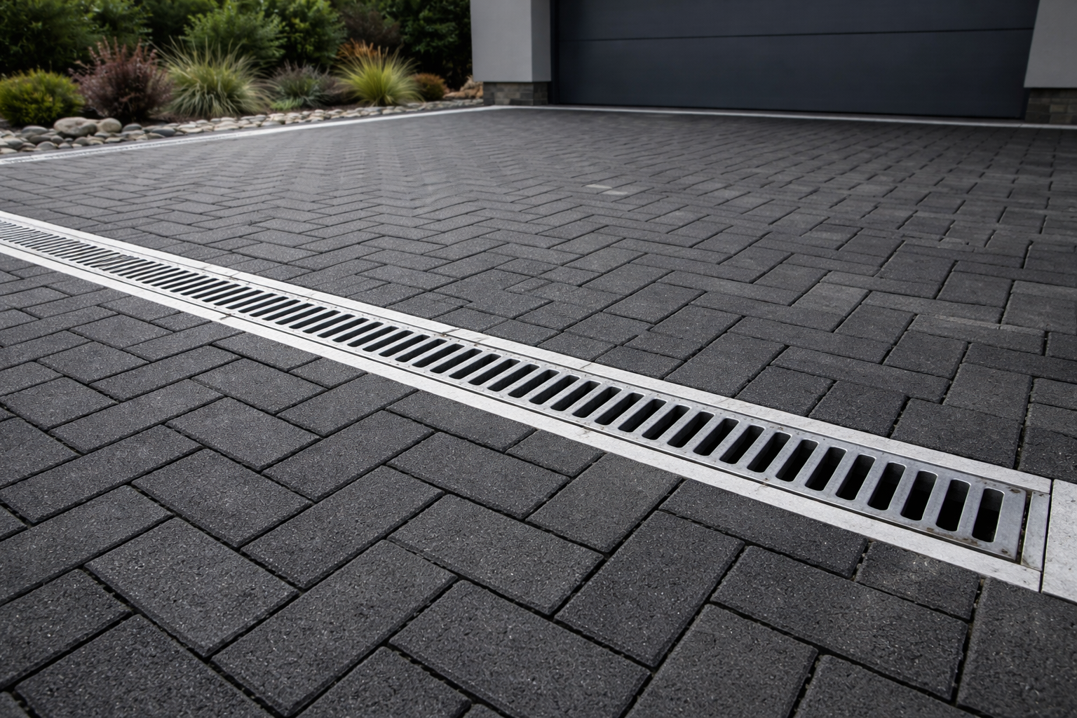 A long, narrow drain installed in driveways, patios, or garage entrances that captures surface water before it can pool or flow where it shouldn’t.