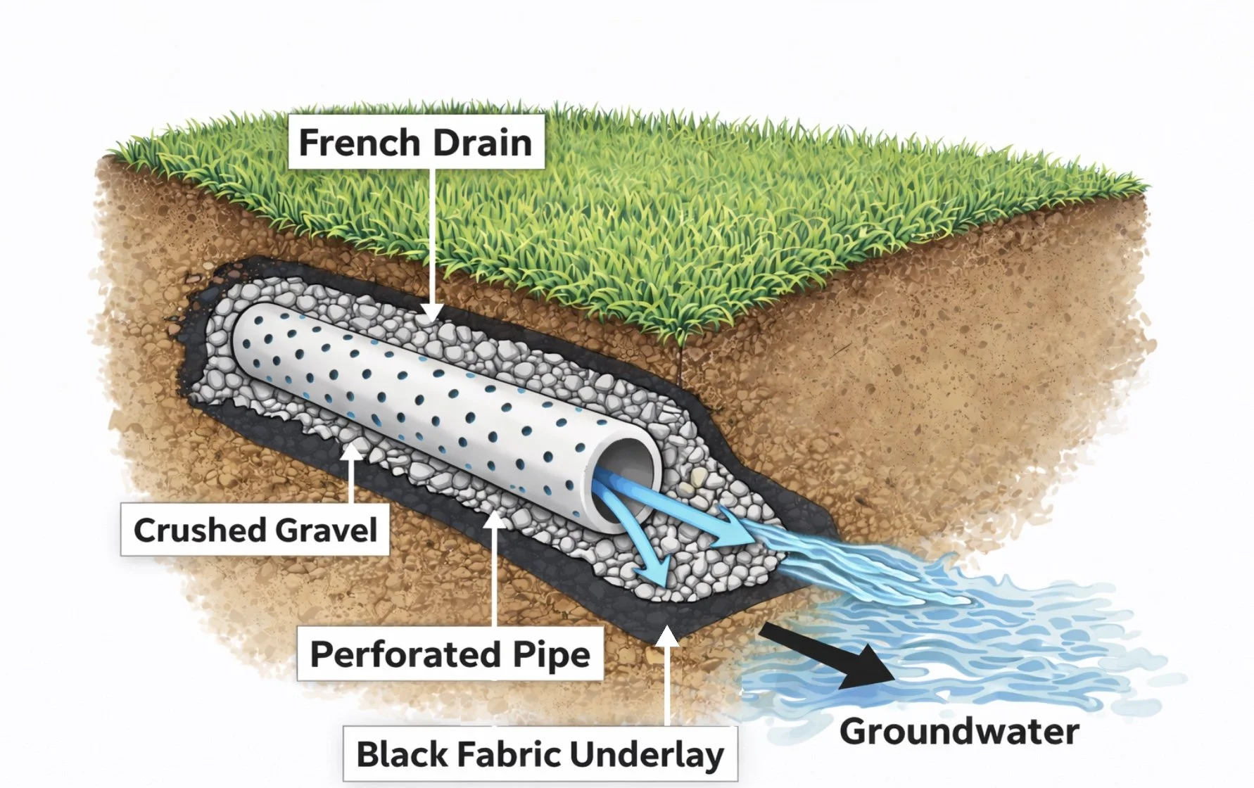 A French drain is a gravel-filled trench with a perforated pipe underneath that collects and redirects groundwater away from problem areas.